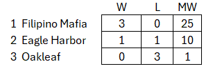 Match format: Each team brings 3 doubles teams (3.5) and under. Every team plays every other team 1 game to 15 win by 2. The team with the most wins wins the match! Example: a total of 9 matches are played. A team could win 5-4, 6-3, 7-2, 8-1, or 9-0.