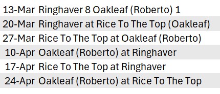 Each club brings 3 teams. Each team plays each team of their opponents 1 game to 15, win by 2. Match winner is determined by the number of wins.