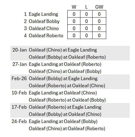 Season champion will be determined by won-loss record, head to head (first tie breaker), and total matches won (3rd tiebreaker) and a play-off match if necessary.